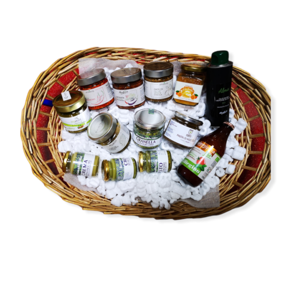 Paniers garnis composés de différentes sortes de délices italiennes.